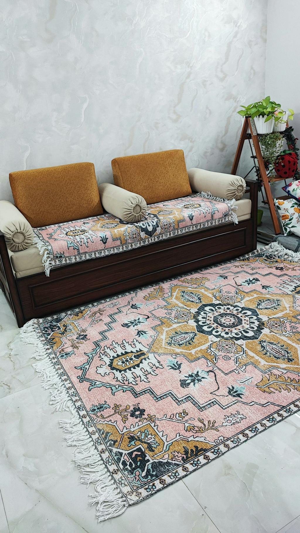 - Predominantly distressed peach with multi shades, creating a sophisticated and vibrant look.